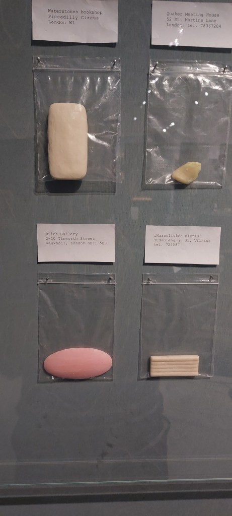 L’attitudine è comparativa ed etnografica; l’effetto è simile a quello sortito da collezioni di specimen fossili o geologici in un museo di scienze naturali. Quest’opera, per inciso, mi ha colpito perché mostra la divaricazione fra un concetto pur semplice e umile come quello di saponetta, e l’infinita varietà materiale a questo sotteso, campionato con esemplari di forme e colori diversi, con gradi diversi di consunzione, recanti anche le tracce indessicali di chi le ha usate nel tempo. Esemplari tutti accostabili per funzione e definizione, dunque, eppure fra loro irriducibili per aspetto e storia.