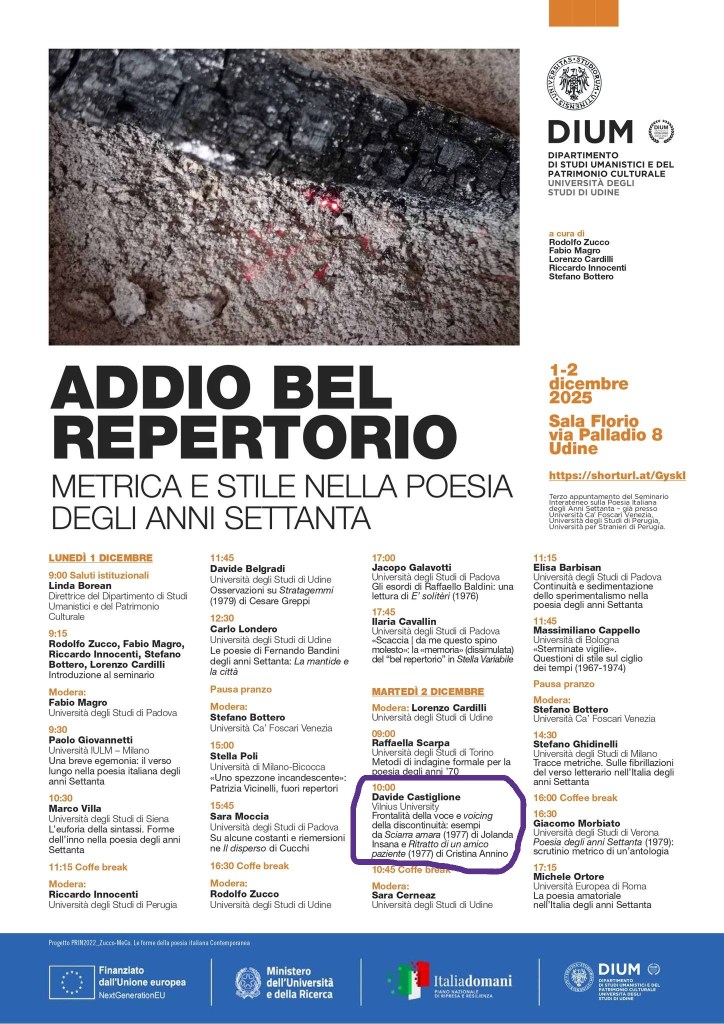 Annuncio con piacere che domani torno per qualche giorno in Italia, a Udine, in occasione di un convegno su metrica e stile nella poesia italiana degli anni Settanta, insieme a molti stimati colleghi. Il mio intervento si intitolerà Frontalità della voce e voicing della discontinuità: esempi da Sciarra amara (1977) di Jolanda Insana, e Ritratto di un amico paziente (1977) di Cristina Annino. Analizzerò strategie polifoniche e di contaminazione dei registri in queste due grandi poete, e probabilmente pubblicherò sul blog il testo della mia relazione. Stay tuned!