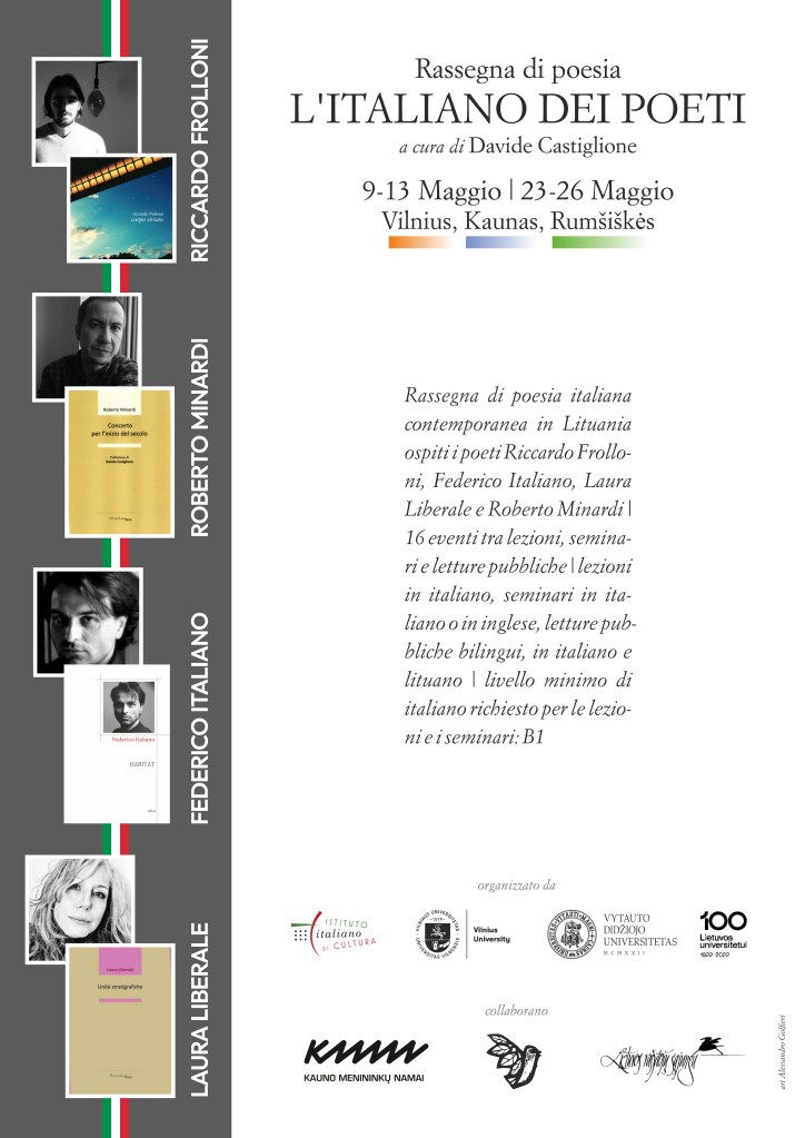 Nel maggio 2022 ho invitato quattro poeti italiani (Riccardo Frolloni, Federico Italiano, Laura Liberale e Roberto Minardi) a Vilnius, grazie ai fondi dell’Erasmus+ e con il coinvolgimento di alcune istituzioni locali, tra cui l’Istituto italiano di cultura di Vilnius e i dipartimenti di italianistica di Vilnius e Kaunas. Gli ospiti hanno presentato i loro ultimi libri, tenuto seminari e presentazioni.